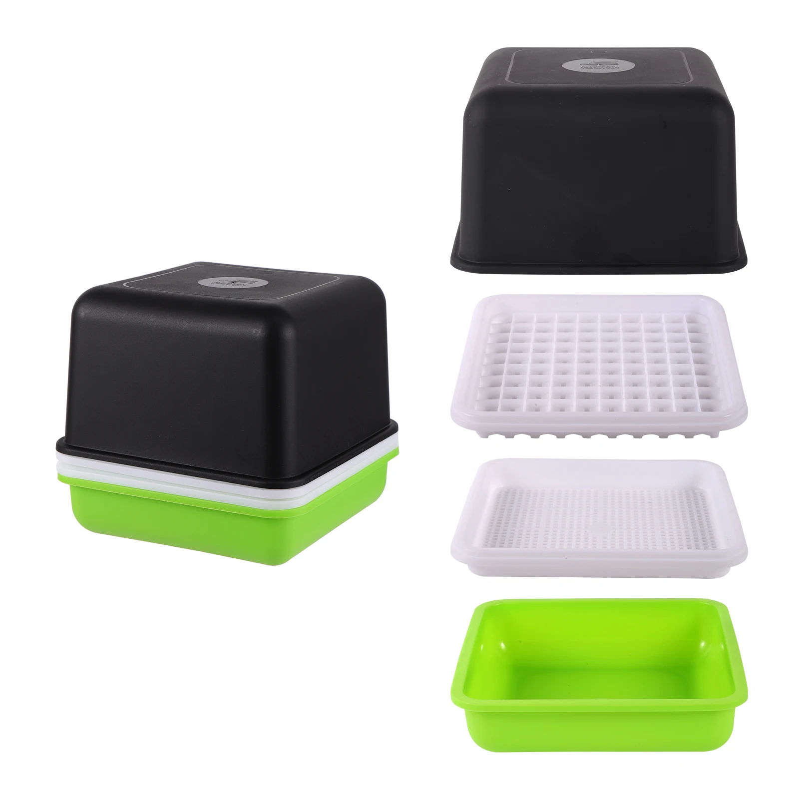 【Details】: A perfect sprouting tray set that includes : 1Pc black shading cover, 1Pc white sparse big grid tray(Square one have extra one dense small grid tray), 1Pc green water container.The grid tray allows for easy drainage and prevents small seeds from falling through.