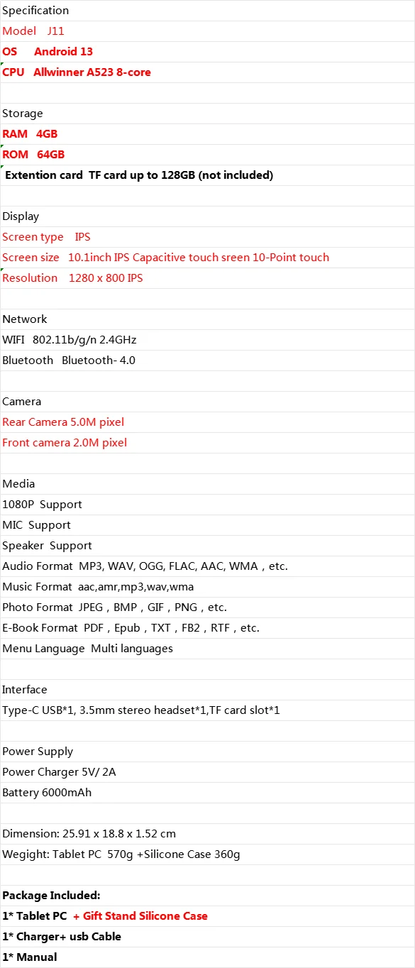The J11 Kids Tablet delivers fun and functionality in one durable design. Featuring Android 13, a powerful Allwinner A523 Octa-Core processor, and a 10.1-inch IPS display, it offers smooth performance and brilliant visuals for learning, entertainment, and creativity. The included silicone case adds protection for active little hands, making it the perfect gift for kids.