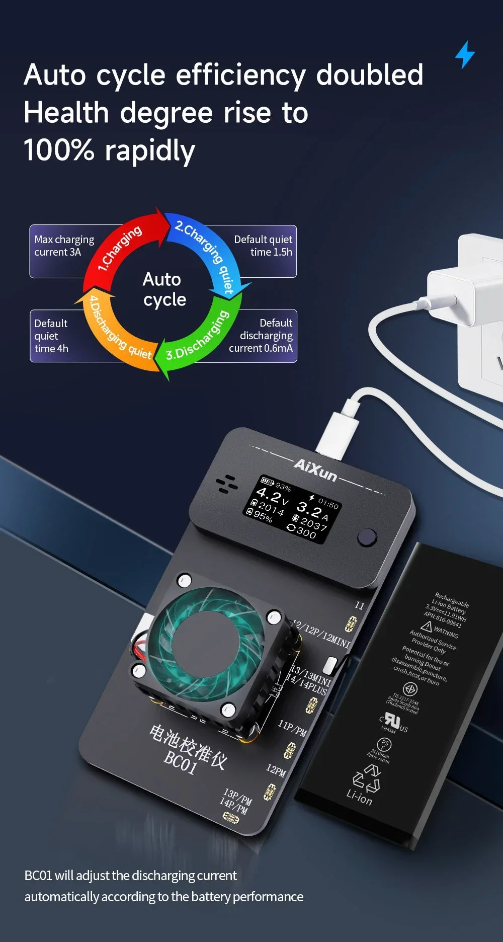 AiXun BC01 battery calibrator is a mobile repair tool designed for 11-14 series iPhone battery calibration. It supports one key startup, battery health can rises to 100% automatically. The HD 0.9 inch OLED display screen provides better visual experience, battery health data, battery capacity, cycle counts,charging state, voltage and current values are clear at a glance. It supports QC/PD fast charge protocols, proper and reasonable layout of battery holder ensures convenient operation. The discharging current can be adjusted automatically according to the cell performance, and the wind speed can also be adjusted automatically based on the power and temperature change. The built-in overheating protection function can protect battery from being burned properly.