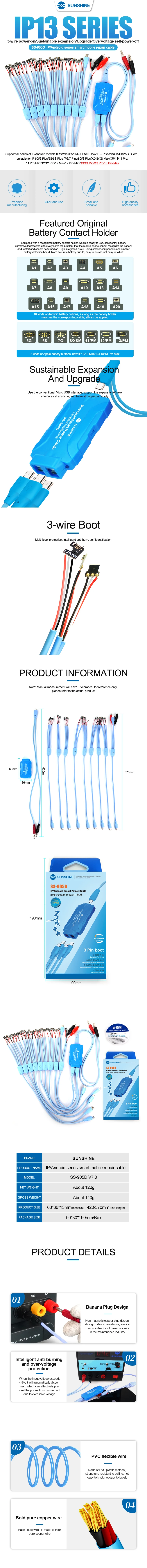 SUNSHINE SS-905D V10.0 New Phone Smart Power Cable For iPhone 6S-16 Pro Max Samsung Huawei DC Power Supply Current Testing Cable