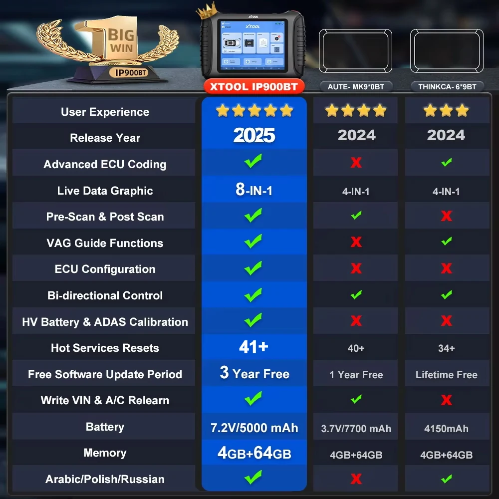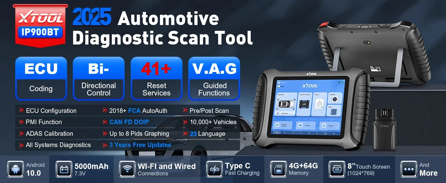 The XTOOL InPlus IP900BT is the upgraded professional Bluetooth automotive diagnostic tool designed for mechanics, workshops, and advanced DIYers. With lifetime free use, ECU coding, 41+ service resets, VAG guided functions, CAN FD & DoIP support, and 3 years of free updates, it’s built to deliver dealer-level diagnostics across 200+ brands and 20,000+ vehicle models.