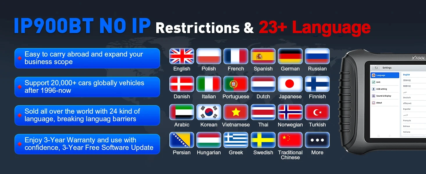 XTOOL InPlus IP900BT Automotive Scanner English is default language, if you need other language, Simply provide us with your device's S/N. to Break down language barriers effortlessly with multilingual menu feature. Support Polish, Portuguese, Arabic, Russian, French, German, Spanish, Dutch, Finnish, Italian, English, Japanese, Korean, Thai, Turkish, Danish, Hungarian, Norwegian, Swedish, Greek, Vietnamese, Persian, Chinese and etc.