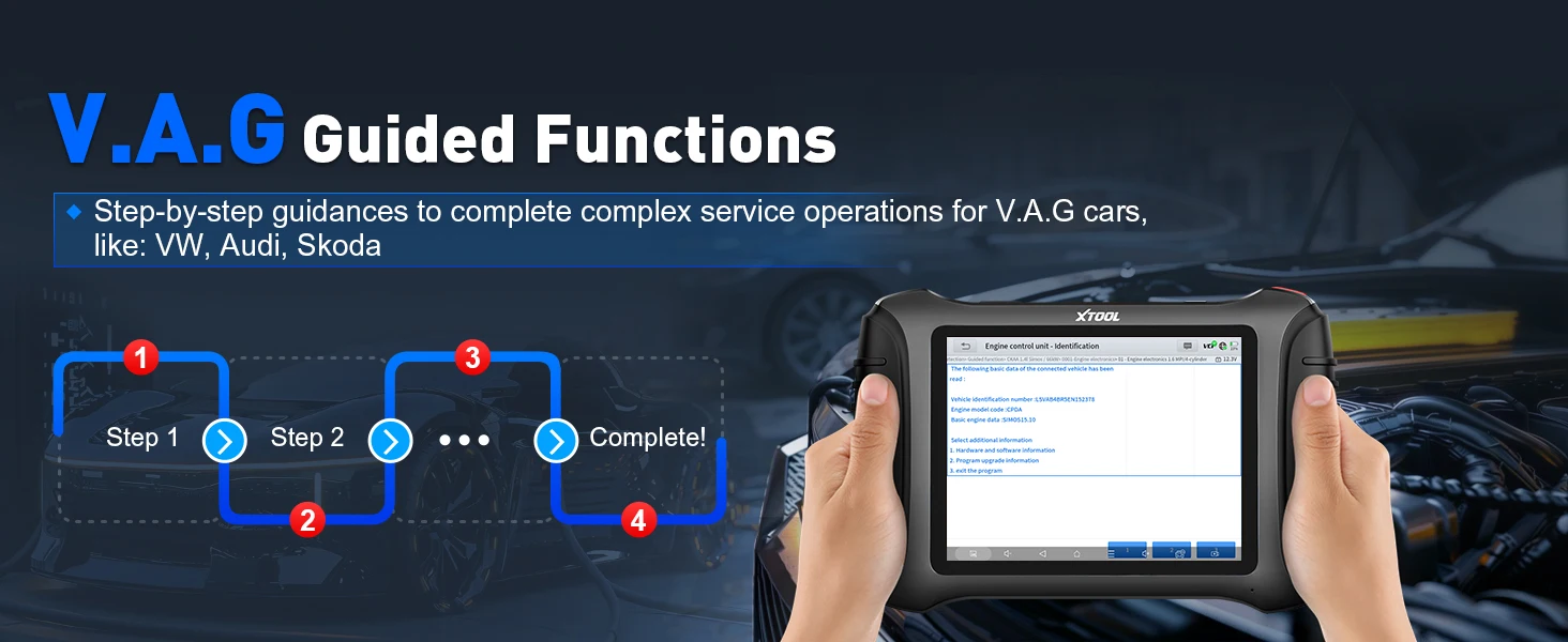 Guided functions offer step-by-step guidance for VAG group cars (For VW/For Audi/For Skoda/For Seat) and skip trouble in looking up channel number and login code. with this guide function IP900BT can perform complex functions such as special functions, ECU coding, etc., to help your diagnostic step by step with instructions.