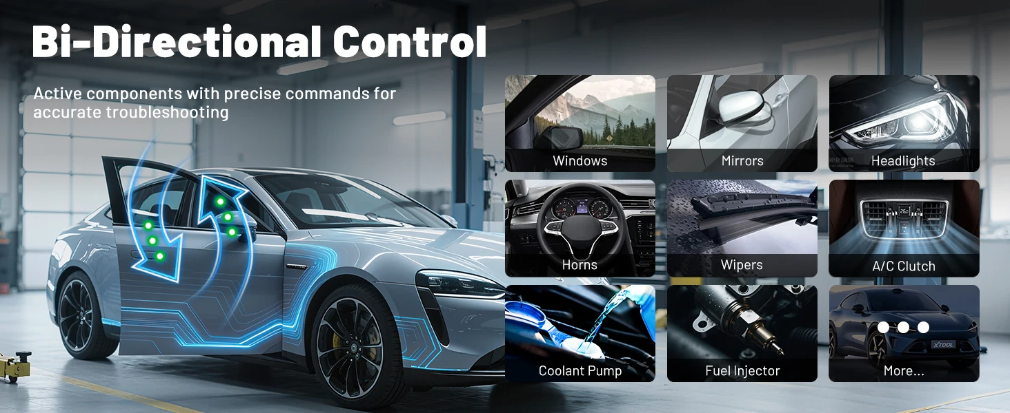 Bi-Directional Control in automotive diagnostics refers to a feature that allows a diagnostic tool to both send commands to and receive responses from a vehicle's electronic systems. Enhanced ability to interact with and manage vehicle systems. By allowing commands and feedback, it supports comprehensive testing, precise diagnostics, and efficient repair and maintenance procedures. It enables the tool to actively interact with vehicle components and systems in real-time.